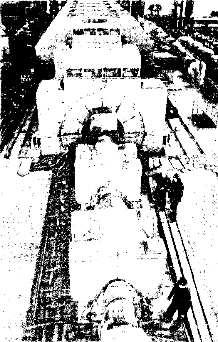 (рис. 3). В высокотемпературных графито-газовых реакторах возможно применение обычного газотурбинного цикла. Реактор в этом случае выполняет роль камеры сгорания. При работе реактора концентрация делящихся изотопов в ядерном топливе постепенно уменьшается, и топливо выгорает. Поэтому со временем их заменяют свежими. Ядерное горючее перезагружают с помощью механизмов и приспособлений с дистанционным управлением. Отработавшее топливо переносят в бассейн выдержки, а затем направляют на переработку. К реактору и обслуживающим его системам относятся: собственно реактор с биологической защитой, теплообменники, насосы или газодувные установки, осуществляющие циркуляцию теплоносителя; трубопроводы и арматура циркуляции контура; устройства для перезагрузки ядерного горючего; системы спец. вентиляции, аварийного расхолаживания и др. В зависимости от конструктивного исполнения реакторы имеют отличит, особенности: в корпусных реакторах топливо и замедлитель расположены внутри корпуса, несущего полное давление теплоносителя; в канальных реакторах топливо, охлаждаемые теплоносителем, устанавливаются в спец. трубах-каналах, пронизывающих замедлитель, заключённый в тонкостенный кожух. Такие реакторы применяются в России (Сибирская, Белоярская АЭС и др.), Для предохранения персонала АЭС от радиационного облучения реактор окружают биологической защитой, основным материалом для которой служат бетон, вода, серпантиновый песок. Оборудование реакторного контура должно быть полностью герметичным. Предусматривается система контроля мест возможной утечки теплоносителя, принимают меры, чтобы появление не плотностей и разрывов контура не приводило к радиоактивным выбросам и загрязнению помещений АЭС и окружающей местности. Оборудование реакторного контура обычно устанавливают в герметичных боксах, которые отделены от остальных помещений АЭС биологической защитой и при работе реактора не обслуживаются, Радиоактивный воздух и небольшое количество паров теплоносителя, обусловленное наличием протечек из контура, удаляют из необслуживаемых помещений АЭС спец. системой вентиляции, в которой для исключения возможности загрязнения атмосферы предусмотрены очистные фильтры и газгольдеры выдержки. За выполнением правил радиационной безопасности персоналом АЭС следит служба дозиметрического контроля. При авариях в системе охлаждения реактора для исключения перегрева и нарушения герметичности оболочек ТВЭЛов предусматривают быстрое (в течение несколько секунд) глушение ядерной реакции; аварийная система расхолаживания имеет автономные источники питания. Наличие биологической защиты, систем спец. вентиляции и аварийного расхолаживания и службы дозиметрического контроля позволяет полностью обезопасить обслуживающий персонал АЭС от вредных воздействий радиоактивного облучения. Оборудование машинного зала АЭС аналогично оборудованию машинного зала ТЭС. Отличит, особенность большинства АЭС — использование пара сравнительно низких параметров, насыщенного или слабо перегретого. При этом для исключения эрозионного повреждения лопаток последних ступеней турбины частицами влаги, содержащейся в пару, в турбине устанавливают сепарирующие устройства. Иногда необходимо применение выносных сепараторов и промежуточн