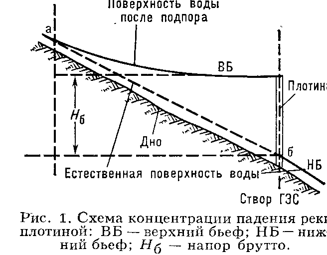 Напор ГЭС создается концентрацией падения реки на используемом участке плотиной(рис1), либо дерива