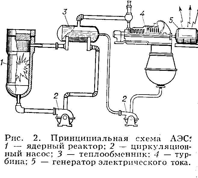 Принципиальная схема АЭС с ядерным реактором, имеющим водяное охлаждение, приведена на рис. 2. Тепло, выделяется в активной зоне реактора, теплоносителем вбирается водой (теплоносителем) 1-г контура, которая прокачивается через реактор циркуляционным насосом г Нагретая вода из реактора поступав в теплообменник (парогенератор) 3, где передаёт тепло, полученное в реакторе воде 2-го контура. Вода 2-го контура испаряется в парогенераторе, и образуется пар поступает в турбину 4. Наиболее часто на АЭС применяют 4 типа реакторов на тепловых нейтронах 1) водо-водяные с обычной водой в качестве замедлителя и теплоносителя; 2) графито-водные с водяным теплоносителем и графитовым замедлителем; 3) тяжеловодные с водяным теплоносителем и тяжёлой водой в качестве замедлителя 4) графито-газовые с газовым теплоносителем и графитовым замедлителем. Выбор преимущественно применяемого типа реактора определяется главным образом накопленным опытом в реактороносителе а также наличием необходимого промышленного оборудования, сырьевых запасов и т. л. В России строят главным образом графито-водные и водо-водяные реакторы. На АЭС США наибольшее распространение получили водо-водяные реакторы. Графито-газовые реакторы применяются в Англии. В атомной энергетике Канады преобладают АЭС с тяжеловодными реакторами.