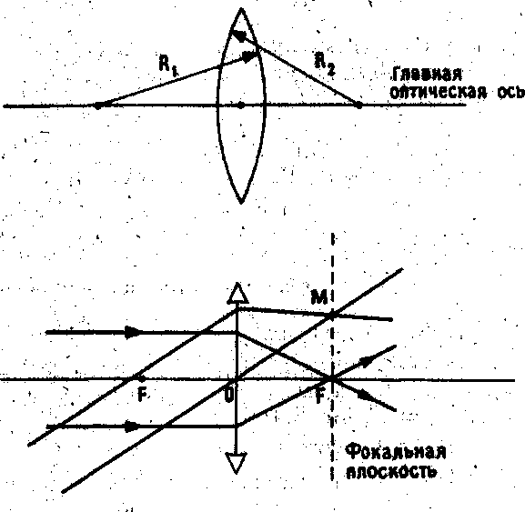 Линза представляет собой прозрачное тело, ограниченное криволинейными поверхностями. Простейшая линза —- сферическая. Преломление лучей при прохождении их через линзу строго определяется законами преломления. Расчеты, проводимые на основании этих законов показывают, что линзы можно разделить на два типа: собирающие ни рассеивающие Рассмотрим тонкую линзу, т. е. линзу, максимальная толщина которой значительно меньше ее радиусов кривизны (рис. 3). Главной оптической осью называется прямая, проходящая через центры сферических поверхностей, ограничивающих линзу. Радиусы этик сфер называются радиусами кривизны, Фокусом линзы называется точка пересечения F преломленных линзой лучей, падающих параллельно равной оптической оси. Плоcкость, проходящая через фокус перпендикулярно главной оптической оси, называется фокальной плоскостью. Оптическим центром линзы называется точка, при прохождении через которую любой луч преломляется таким образом, что направление его распространения не изменяется. Оптический центр — это точка пересечения главной оптической оси с тонкой линзой. Другие прямые, проходящие через