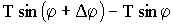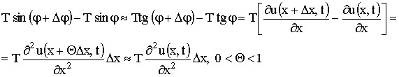 На концах этого элемента, по касательным к струне, действуют силы Т. Пусть касательные образуют с осью Ox углы