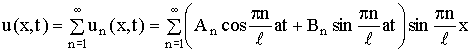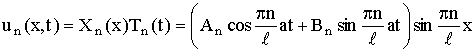 чем полностью определяется функция (24), дающая решение исследуемой задачи. Итак, мы доказали, что ряд (24), где коэффициенты A n и B n определены по формуле (30), если он допускает двукратное почленное дифференцирование, представляет функцию u (x, t), которая является решением уравнения (1) и удовлетворяет граничным и начальным условиям (9) и (10).