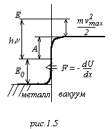 Фотон это частица, у которой масса равна нулю или, чтобы не было недоразумений, масса покоя равна нулю. Частица с нулевой массой обязана двигаться со скоростью света в любой системе отсчёта. Будете ли убегать от неё, всё равно её скорость равна скорости света. 2 ) 2 Имеются такие явления, для которых свет демонстрирует волновые свойства (дифракция, интерференция) , имеются явления, когда он демонстрирует корпускулярные свойства (например, фотоэффект) , возникает естественный вопрос, что же он такое на самом деле, волна или частицы? Кто был прав, Ньютон или Гюйгенс, которые придерживались на первый взгляд взаимоисключающих точек зрения? Ответ такой – вопрос, что он такое на самом деле, предполагает ответ из двух взаимоисключающих альтернатив, или он есть то, или другое, или он есть ни то и ни другое. Это означает, что свет более сложный объект, чем можно было себе представлять. Тут надо иметь в виду вот что: понятия УволнаФ и УчастицаФ это наши изделия, мы пытаемся описать мир в понятиях, которые мы придумали, удачно или неудачно. Неудачные вымирают, удачные же остаются, но надо иметь в виду, что это всегда наши понятия, и, в общем-то, они могут оказаться более сложными и не укладываться в рамки, в которые мы пытаемся их запихнуть с помощью языка. Приведём пример. Скажем, у нас два слова: мы знаем, что такое стол, и мы знаем, что такое стул. Кто-то приходит и раз – ставит табуретку, и спрашивает, что это такое. Четыре ножки, ровная поверхность – это стол, с другой стороны на ней сидят – это стул. На самом деле это не стол и не стул, а, так сказать, по потребности может быть и тем и другим. Значит, какой выход? Надо придумать специально новое слово УтабуреткаФ . Оказалось, что реальность не делится на классы понятий волны и частицы, мы дальше увидим, что положение ещё более драматично. Поскольку нового слова для такого объекта как свет ещё не придумали, приходится пользоваться такими выражениями, что в некоторых ситуациях свет ведёт себя как волна, в некоторых как частица. Важно, чтобы эти ситуации были действительно различными. 1 ) Имеется чётко ограниченный круг явлений, когда объект проявляет корпускулярные свойства, и вполне определённые ситуации, когда объект проявляет волновые свойства. 2 ) Никаких проблем нет. Конечно, должен быть соответствующий математический аппарат и математическая теория, которая позволяет давать ответы на соответствующие вопросы. Повторяю, дальше, когда мы будем рассматривать квантовую теорию, там мы будем сталкиваться с ещё более удивительными и драматическими проявлениями вот этой дилеммы волна – частица. Закончим рассмотрение фотоэффекта. Напомню, на металл падает свет, из металла вылетают электроны, тогда это иллюстрируется такой энергетической диаграммой ( рис. 1.5 ) .