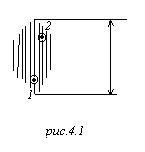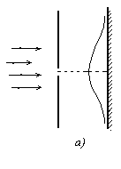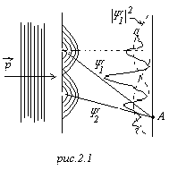 ) это плоская волна, значит, мы устроим пучок частиц с определённым импульсом, частица с определённым импульсом описывается волновой функцией. Эта волна падает на экран со щелями, дальше из этих щелей выходит сферическая волна, и на экране эти волны интерферируют. Если из верхней щели идёт волна