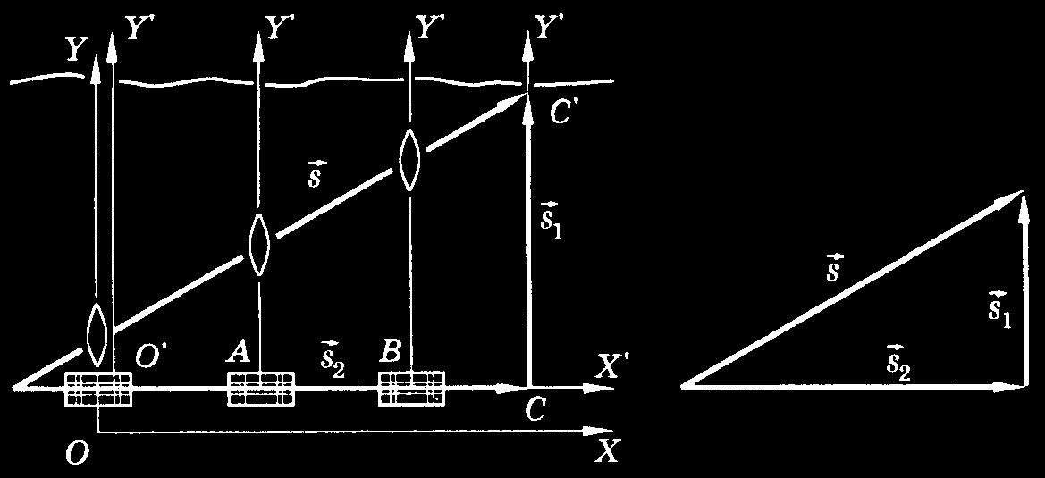 систему координат XOY - это неподвижная система отсчета. Другую систему X'O'Y' свяжем с плотом - это подвижная система координат. Относительно системы X'O'Y' (плота) лодка за время t совершает перемещение