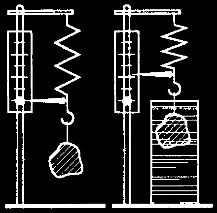 Если на крючок динамометра подвесить тело и отметить его показания, а затем тело опустить в воду и снова отметить показания, то увидим уменьшение показаний динамометра (cм. рис.,