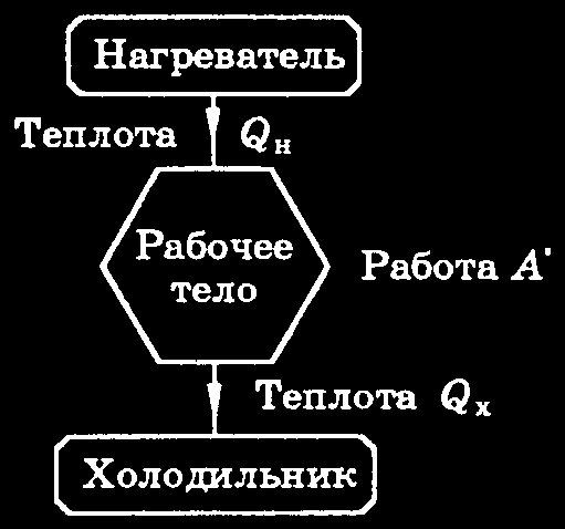 которым является атмосфера или специальные устройства (см. рис.) . Ни один тепловой двигатель не может работать при одинаковой температуре его рабочего тела и окружающей среды. Обязательно температура нагревателя больше температуры холодильника. При совершении работы тепловыми двигателями происходит передача теплоты от более горячих тел к более холодным. Рабочее тело двигателя получает количество теплоты