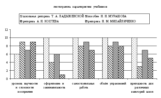 (30; 57 – 58) 2.5. ВОЗМОЖНОСТЬ ИСПОЛЬЗОВАНИЯ УЧЕБНИКОВ РИТОРИКИ В РАЗНЫХ КАТЕГОРИЯХ ШКОЛ Теперь мы попробуем дать краткую характеристику описанным выше учебным пособиям. Н. А. МИХАЙЛИЧЕНКО. РИТОРИКА Это довольно неплохой учебник с хорошими заданиями, но, на наш взгляд, он написан языком, который скорее будет понятен преподавателю, нежели учащимся. Изобилие сложных фраз ещё не является показателем педагогической грамотности составителя учебника. Нам не понравилось, что автор взял за определение риторики лишь одну её сторону - ораторское искусство , т е. учебник призван готовить ораторов. Поэтому мы считаем, что курс Н. А. МИХАЙЛИЧЕНКО правильнее было бы назвать " МАСТЕРСТВОМ ПУБЛИЧНОГО ВЫСТУПЛЕНИЯ " . В таком случае, его не имеет смысла разбивать на несколько лет, а в целях лучшего усвоения включить в программу одного года (какого - зависит от развития и успеваемости коллектива) . Как и указано самим автором, этот курс можно ввести лишь в специализированных учебных заведениях: гимназиях, лицеях, школах с гуманитарным профилем) , т.к. для других он будет сложен. И в этом мы видим большой " - " составителя, потому, что уметь убеждающе говорить и просто уверенно выражать свои мысли должны все.