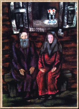 И все же подлинные масштабы и уникальность дарования Каплана обнаружились гораздо позднее, когда он исполнил обширную серию цветных литографий по мотивам повести Шолом-Алейхема "Заколдованный портной" (1953-63). Здесь в 50 крупноформатных листах художник соединил собственные задушевные впечатления детства и юности с мотивами еврейского традиционного народного искусства и поразил зрителей декоративным богатством и трогательным смешением лиризма и юмора, наивности и мудрости. Серия оказалась переломной в его творчестве. Одновременно с нею и вслед за нею в течение полутора-двух десятилетий, неустанно и вдохновенно работая, Каплан создал громадное количество литографий, объединяемых в большие серии (некоторые достигали нескольких десятков сюжетов и даже более 100). Все они были посвящены темам, почерпнутым из еврейской литературы, - чаще всего из произведений Шолом-Алейхема ("Тевье-молочник", 1957-61; "Песнь песней", 1962; "Стемпе-ню", 1963-67) и из народной литературы (сказка "Козочка", 1957-61; "Еврейские народные песни", 1958-60). В этих листах Каплан сохранял большей частью принципы декоративного решения, счастливо найденные им в "Заколдованном портном", но не пренебрегал и решениями чисто изобразительными.