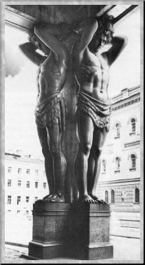 Атланты. Скульптурное оформление углового пилона в портике здания Нового Эрмитажа в Санкт-Петербурге. 1844-49. Сердоболъский гранит