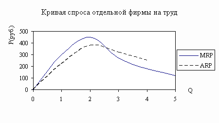 Как следует из таблицы, фирма, нанимая второго рабочего, увеличивает объем продукции с 10 до 25 единиц, то есть предельный продукт труда второго рабочего составляет 15 единиц, третьего рабочего — 9 единиц (34-25) и т.д. Но фирма заинтересована не только в приросте продукции, но и в том, какую “отдачу” дает каждый дополнительно нанятый рабочий, или какой прирост дохода он обеспечивает фирме. Поэтому важно исчислить предельный продукт труда в денежном выражении. Фирма функционирует в условиях совершенной конкуренции, а значит, она не может воздействовать на цену продукции, которая является неизменной и в нашем примере составляет 30 руб. Тогда, вычисляя предельный продукт труда в денежном выражении по формуле: MRP = MP ´ P предельный продукт труда 1-го рабочего равен 300 руб. (10 ед. ´ 30 руб. = 300 руб.), 2-го рабочего — 450 руб. (15 ´ 30 = 450 руб.), третьего рабочего равен 270 руб. и т.д. Из таблицы видно, что величина предельного продукта в денежном выражении сначала растет, а затем начинает снижаться. Это происходит в соответствии с законом “убывающей отдачи”. В силу действия этого закона, каждое дополнительное увеличение единиц труда при неизменной величине других ресурсов через определенное время ведет к снижению прироста продукции. Вывод : В условиях совершенной конкуренции отдельная фирма будет нанимать рабочих до тех пор, пока предельный продукт их труда в денежном выражении не станет равным предельным затратам на оплату их труда.