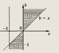 Для решения этого неравенства на координатной плоскости (х; b) найдем области, где выражение, стоящее в левой части неравенства, сохраняет знак и определим его. Границы этих областей задаются соотношениями x + 1 > О, х + 1 = 1, т. е. х = 0 к b = х. На рис.