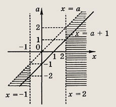 области, где левая часть положительна, заштрихованы. Границы, координаты точек которых не удовлетворяют неравенству, изображены пунктиром. Следует учесть, что при переходе через границу а = х - 1 выражение Iog23 (х - а) знак не меняет. Отсюда получаем ответ. Ответ: при