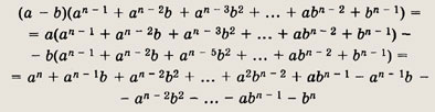 Задание 15. аn - bn = (а - b) (аn - 1 + an - 2b + an - 3b2 + ... + bn - 1), где a, b € R Решение: Преобразуем правую часть доказываемого равенства: