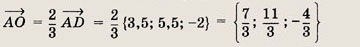 Задание 8. Известны координаты вершин треугольника: А(-2; -3; 8); B(2; 1; 7); С(1; 4; 5), Найдите координаты точки пересечения медиан этого треугольника. Решение: Пусть D — середина отрезка ВС. Эта точка имеет координаты D(1,5; 2,5; 6). Точка О пересечения медиан делит отрезок AD в отношении АО : OD = 2 : 1, т.е. вектор