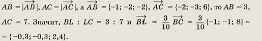 биссектриса. Задание 11. Даны вершины треугольника: А(4; 5; 0); Б(3; 3; -2) и С(2; 2; 6). Найдите точку пересечения стороны ВС и биссектрисы угла А. Решение: Пусть AL — биссектриса треугольника ABC. Согласно свойству биссектрисы, отношение BL : LC = АВ : АС. Так как,