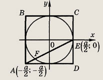 Задание 109. Точки А(1; 2; -2), (4; 2; -2) и С(3; 4; -2) лежат на окружности основания конуса, высота которого равна 3. Найдите координаты его вершины, если конус пересекает плоскость z = 0. Решение. а) Положим |АВ| = 2а, а > 0. Введем на плоскости систему координат Оху так, что А(-а; 0), В(0; а), а ось ординат проходит через середину отрезка АВ перпендикулярно этому отрезку (рис.).