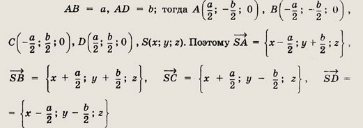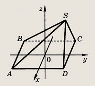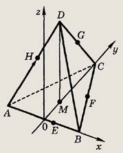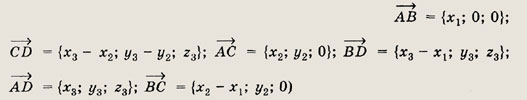 Решение. Введем систему координат Oxyz так, чтобы А = 0, точка В лежала на оси Ох, а отрезок CD был параллелен координатной плоскости Оху. Тогда: А(0; 0; 0), B(x1; 0; 0), С(х2; у2; z), D(x3; у3; z),