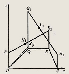 получим уравнение плоскости: 9х - 8у - 5z + 2 = 0. Вектор n = {9; -8; -5} является направляющим вектором прямой, проходящей через К1 (0; 0; 1) перпендикулярно указанной плоскости. Пусть Р — точка пересечения этой прямой и плоскости. Запишем уравнения