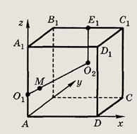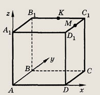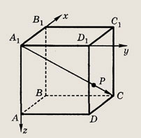а на ребре ММ1 — точка В так, что длина отрезка М1В равна 2/5. Через центр куба и точки А и В проведена плоскость, точка Р — проекция точки К1 на эту плоскость. Найдите длину отрезка АР. Решение. Введем систему координат Oxyz так, чтобы вершина А совпала с началом координат, ребро AD лежало на оси абсцисс, ребро АВ — на оси ординат, а ребро АА1 — на оси аппликат. Тогда: D (а; 0; 0),