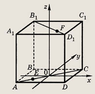Задание 93. Дан куб ABCDA1B1C1D1, длина ребра которого равна а. Найдите радиус сферы, проходящей через точки А, В1, Е и F, если точки Е и F лежат на ребре СС1 и СЕ = EF = FC1. Решение. Расположим систему координат Oxyz так, чтобы ее начало совпало с вершиной А, а координатные плоскости совпали с гранями куба (рис.).
