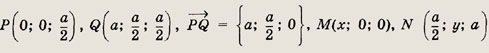 Задание 100. Длина ребра куба ABCDA1B1C1D1 равна а. Точки Р, К, L — середины ребер AA1,A1D1 и В1С1 соответственно, точка Q — центр грани CC1D1D. Отрезок MN, концы PQ и перпендикулярен ей. Найдите длину этого отрезка. Указание. См. аналогичную задачу 98. Ответ: