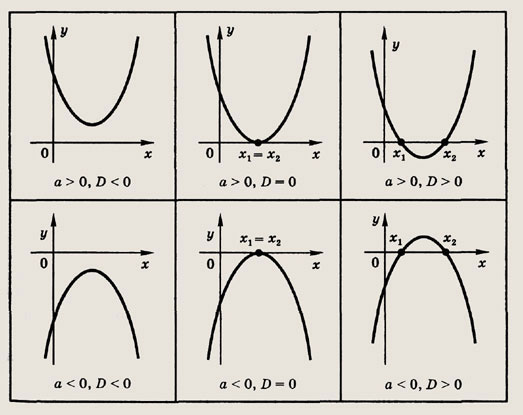 Решения всех этих неравенств получаем из следующей таблицы графиков квадратного трехчлена у = ах2 + bх + с.