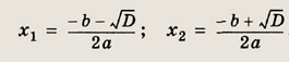 Напомним, что здесь D = b2 - 4ас — дискриминант квадратного трехчлена у = ах2 + bх + с. В случае, когда D > 0, корни х1 и х2 квадратного трехчлена вычисляются по формулам