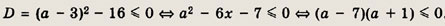 (77—81): Задание 77. x2 -2(а -1)x + а + 5 > 0 Указание: Поскольку коэффициент при х2 положителен, нужное значение а определяется условием D < 0. Ответ: (-1; 4) Задание 78. (а2 - 1I)x2 + 2(а - 1)x + 2 > 0 Ответ: