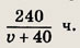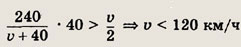 Задание 107. Из города А в город В, находящийся в 240 км от А, со скоростью 40 км/ч выходит автобус. Одновременно с ним из Б в A с постоянной скоростью v (км/ч) выезжает автомобиль. Через полчаса после встречи автомобиль, не доезжая до города А, поворачивает обратно и с прежней скоростью движется по направлению к В. Найдите все те значения и, при которых автомобиль приходит в В раньше, чем автобус. Решение: Время, которое автомобиль и автобус затратили до их встречи, составляет