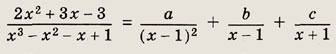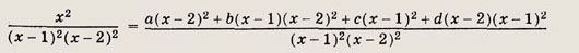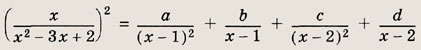 Решение: Отметим, что (х2 - Зх + 2)2 = (х - 1)2(х - 2)2. Заданное равенство есть равенство двух дробей, из которых одна представлена в виде суммы простейших дробей. Имеем