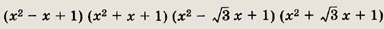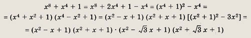 Разложите на множители многочлены (84—89): Задание 84. х4+ х2 + 1 Указание: х4 + х2 + 1 = х4 + 2х2 + 1 -- х2 = (х2 + 1)2 - х2. Ответ: (х2 - х + 1)(х2 + х + 1). Задание 85. х8 + х4 + 1 Решение: Имеем