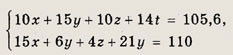 Известно, что 10 кг картофеля, 15 кг свеклы, 10 кг моркови и 14 кг капусты стоят вместе 105,6 р., а 15 кг картофеля, 6 кг свеклы, 4 кг моркови и 21 кг капусты — 110 р. Какова общая стоимость 20 кг картофеля, 12 кг свеклы, 8 кг моркови и 28 кг капусты? Решение: Пусть х, у, z и t — цены в рублях за 1 кг картофеля, свеклы, моркови и капусты соответственно. Тогда по условию