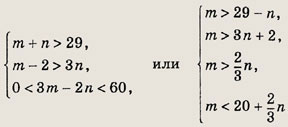 Ответ: 44 комплекта Производительность первого автомобильного завода не превышает 950 машин в сутки. Производительность второго завода первоначально составляла 95% производительности первого завода. После ввода дополнительной линии второй завод увеличил производство машин в сутки на 23% от числа машин, производимых на первом заводе, и стал их выпускать более 1000 штук. Сколько автомобилей в сутки выпускал каждый завод до реконструкции второго завода? Ответ: 900 и 855 машин Бригада маляров белила потолки в двух комнатах. Площадь потолка в первой комнате в 3 раза больше, чем во второй, и в первой комнате работало на 6 человек больше. Когда побелка потолка в первой комнате была закончена, во второй комнате еще работали. Какое наибольшее число маляров могло быть в бригаде, если все они начали работать одновременно и работали с одинаковой производительностью? Ответ: 10 человек В двух бригадах более 27 человек рабочих. Число рабочих в первой бригаде более чем вдвое превышает число рабочих во второй бригаде, уменьшенное на 12. Число рабочих во второй бригаде более чем в 9 раз превышает число рабочих в первой бригаде, уменьшенное на 10. Сколько человек в каждой бригаде? Ответ: 11 и 17 человек В двух ящиках находится более 29 одинаковых деталей. Число деталей в первом ящике, уменьшенное на 2, более чем в 3 раза превышает число деталей во втором ящике. Утроенное число деталей в первом ящике превышает удвоенное число деталей во втором ящике, но это превышение меньше 60. Сколько деталей в каждом ящике? Решение: Пусть m и n — число деталей в первом и во втором ящиках соответственно. Тогда из условия задачи вытекает следующая система неравенств:
