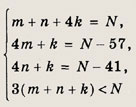 В киоске продаются три вида наборов игрушек: деревянные, пластиковые и мягкие. Для детского сада купили по одному набору деревянных и пластиковых игрушек и четыре набора мягких. При этом каждый ребенок получил по одной игрушке. Если бы было куплено четыре набора деревянных игрушек и один набор мягких игрушек, то 57 детям игрушек не досталось бы, а если бы купили четыре набора пластиковых и один набор мягких игрушек, то 41 ребенок остался бы без игрушки. Сколько всего детей в детском саду, если, купив по три набора игрушек каждого вида, сад не обеспечил бы всех детей игрушками? Решение: Пусть m, n, k — числа деревянных, пластиковых и мягких игрушек в каждом из типов наборов, N — число детей в детском саду. Тогда условие задачи приводит к системе