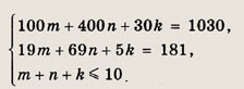Такое число только одно: N = 84. Ответ: 84 ребенка Между городами А и В летают самолеты трех типов. Каждый самолет первого, второго и третьего типа может принять на борт соответственно 230, 110 и 40 пассажиров, а также 27, 12 и 5 контейнеров. Все самолеты этой линии могут принять на борт 760 пассажиров и 88 контейнеров. Найдите число самолетов каждого типа, если их общее число на этой линии не более восьми. Ответ: 2; 2; 2 Завод имеет сборочные линии трех типов. На каждой линии первого, второго и третьего типа ежедневно собираются 100, 400 и 30 приемников первого класса и 19, 69 и 5 приемников высшего класса соответственно. В сумме на всех линиях ежедневно собирается 1030 приемников первого класса и 181 приемник высшего класса. Сколько линий каждого типа на заводе, если их общее число не превосходит 10? Решение: Пусть m, n и k — число линий первого, второго и третьего типа. Тогда