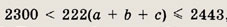 удовлетворяет также первому уравнению исходной системы. Ответ: 254 Из трех различных отличных от нуля цифр а, b и с составляют всевозможные различные трехзначные числа, причем каждая из указанных цифр встречается в записи числа один раз. Оказалось, что сумма всех этих чисел больше 2300, но не превосходит 2443. Найдите число