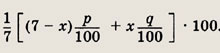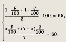 Решив это уравнение, получаем х = 160 г. Ответ: 160 г. Сколько воды нужно выпарить из 500 кг целлюлозной массы, содержащей 90% воды, чтобы получить массу с содержанием воды 50% ? Ответ: 400 кг. Имеются два куска сплава серебра с медью. Один из них содержит 81% меди, другой — 95% . В каком отношении по массе нужно брать сплавы от обоих кусков, чтобы получить новый сплав, содержащий 87% меди? Ответ: 4 : 3 Имеются два сплава золота с серебром. В первом сплаве количество этих металлов находится в отношении 1 : 2, во втором — 2:3. Сколько граммов первого сплава нужно взять, чтобы получить 19 г сплава, в котором золото и серебро находятся в отношении 7 : 12? Ответ: 9 г. Имеются два разных сплава меди со свинцом. Если взять 1 кг первого сплава и 1 кг второго сплава и переплавить их, то получится сплав, содержащий 65% меди. Известно, что при переплавке обоих сплавов, имеющих суммарную массу 7 кг, получается сплав, содержащий 60% меди. Сколько меди будет содержать сплав, получающийся при переплавке куска первого сплава, равного по массе куску второго сплава, и куска второго сплава, равного по массе куску первого сплава? Ответ запишите в процентах. Решение: Пусть х (кг) — масса первого сплава, (7 - х) (кг) — масса второго сплава; р% и q% — процентные содержания меди в первом и втором сплавах. Тогда по условию