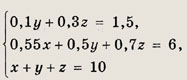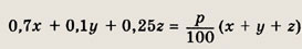 Умножая первое уравнение в системе на 7 и вычитая из результата второе, получаем (7 - х)р + хq = 490, т. е. искомая величина равна 70% (или 4,9 кг). Ответ: 70% Имеются два сплава, состоящие из цинка, меди и олова. Известно, что первый сплав содержит 40% олова, а второй — 26% меди. Процентное содержание цинка в первом и втором сплавах одинаково. Сплавив 150 кг первого сплава и 250 кг второго, получили новый сплав, в котором оказалось 30% цинка. Сколько олова (по массе) содержится в получившемся сплаве? Ответ: Имеются три сплава. Первый содержит 45% олова и 55% свинца, второй — 10% висмута, 40% олова и 50% свинца, третий — 30% висмута и 70% свинца. Из них нужно получить сплав, содержащий 15% висмута и 60% свинца общей массой 10 кг. Сколько килограммов каждого сплава нужно взять? Для удобства запишем данные в таблицу:
