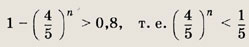 Имеются три куска сплава меди с никелем в отношениях 2:1,3:1и5:1по массе. Из них сплавлен кусок массой 12 кг с отношением содержания меди и никеля 4:1. Найдите массу каждого исходного куска, если масса первого из них вдвое больше массы второго. Ответ: 1,92; 0,96; 9,12 кг. Сплав состоит из олова, меди и цинка. Если от этого сплава отделить 20 г и сплавить с 2 г олова, то во вновь получившемся сплаве масса меди будет равна массе олова. Если же отделить от первоначального сплава 30 г и сплавить с 9 г цинка, то в этом новом сплаве масса олова будет равна массе цинка. Определите (в процентах) состав первоначального сплава. Ответ: 40%; 50% ; 10% Из колбы, в которой содержится 80 г 10%-ного раствора поваренной соли, отливают некоторую часть раствора в пробирку и выпаривают до тех пор, пока процентное содержание соли в пробирке не повысится втрое. После этого выпаренный раствор выливают обратно в колбу. В результате содержание соли в колбе повышается на 2% . Сколько граммов раствора отлили из колбы в пробирку? Ответ: 20 г. В лаборатории имеются растворы поваренной соли четырех различных концентраций. Если смешать первый, второй и третий растворы в весовом отношении 3 : 2 : 1, то получится 15%-ный раствор. Второй, третий и четвертый растворы, взятые в равной пропорции, дают при смешении 24%-ный раствор, а раствор, составленный из равных по массе частей первого и третьего растворов, имеет концентрацию 10% . Какая концентрация получится при смешении второго и четвертого растворов в пропорции 2:1? Ответ: 29 % Из сосуда, содержащего чистый спирт, отлили 1/3 часть и добавили такое же количество воды. Затем отделили 1/3 часть смеси и снова добавили такое же количество воды. Такую операцию проделали k раз. При каком наименьшем k процентное содержание спирта в сосуде станет менее 10% ? Ответ: 6 Из сосуда, содержащего чистую воду, отлили 1/5 часть и добавили такое же количество чистого спирта. Затем отлили 1/5 часть смеси и снова добавили такое же количество чистого спирта. Такую операцию проделали n раз. При каком наименьшем п процентное содержание спирта в сосуде станет больше 80%? Решение: Пусть объем сосуда равен 1 л. Найдем объем чистого спирта в сосуде на каждом шаге. Имеем: