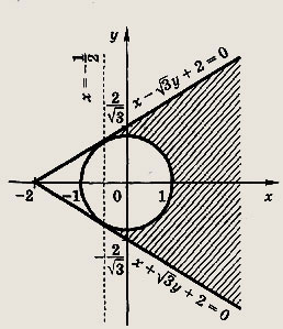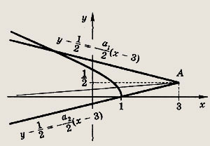 Найдем среди этих прямых касательную к верхней части параболы и прямую, проходящую через точку (1; 0). Подсчеты дают для этих прямых значения