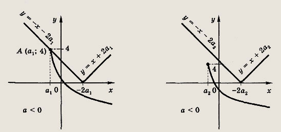 Случай а < 0 несколько сложнее. Здесь нужное неравенство не будет иметь решений, если а < min(a1 a2), где число а1 находим из условия, что точка A(a1; 4) лежит на прямой у = -х - 2a1; а число a2 из условия, что