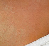 Мелкоточечные элементы сыпи на фоне гиперемированной кожи при краснухе
