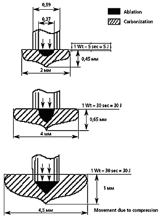 Рис. 1. Схема пространственного распределения зон коагуляции и абляции при контактном воздействии энергией диодного лазера на стопку черной копировальной бумаги. Сходный принцип абляционного лазерного лечения был применен нами и в клинической практике, сначала при базалиомах век, а затем совместно с О.А. Марченко при меланомах хориоидеи, локализующихся в области заднего полюса глаза, в т.ч. юкстапапиллярно [29, 27, 28]. Техника вмешательства была следующей. В традиционных для витреальной хирургии “косых” меридианах через склеру в проекции плоской части ресничного тела в полость глаза вводили витреофаг и стекловолоконный наконечник световода для диодного лазера фирмы “Милон” (С.Е. Гончаров с соавт.). Все манипуляции в полости глаза проводили под контролем операционного микроскопа с конфокальным освещением при использовании хирургической контактной линзы. Сведения о степени выстояния и объеме опухоли, полученные в предоперационном периоде при УЗ В–сканировании, позволяли планировать требуемую глубину внедрения лазерного наконечника в толщу опухоли (рис. 2) и необходимую для полного разрушения опухоли суммарную энергетическую экспозицию.