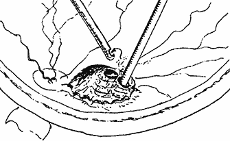 Рис. 2. Схема диод-лазерной абляции юкстапапиллярной меланомы в ходе витрэктомии. При расчетах требуемой дозы исходили из того, что для должного воздействия на 1 мм3 опухолевой ткани необходима энергия до 2 Дж. Чтобы достичь такой энергии от источника с мощностью на выходе 1 Вт, требуется экспонировать излучение в одной и той же позиции до 2 с. Отсюда следует, что при прохождении лазерного наконечника сквозь опухоль толщиной в 5 мм со скоростью 0,5 мм/с при непрерывном излучении доза энергии, поглощенной на этом пути, составит около 10 Дж. Исходя затем из сведений об объеме опухоли, можно планировать и общее время, необходимое для ее эффективного облучения. Так, при опухоли диаметром 5 мм, т.е. при ее объеме 65 мм3 время облучения должно составить 65х2 = 130 с, т.е. 2 мин., а при опухоли диаметром 7 мм, объем которой почти в 3 раза больше (180 мм3) требуемое для ее деструкции время также увеличится втрое (180х2 = 360 сек, т.е. 6 мин.). Результаты лечения по указанной методике первых 12 больных со сроками наблюдения от 1 до 3 лет представлены в табл. 1.