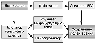 Бетаксолол в лечении глаукомы Betaxolol in glaucoma treatment Betaxolol is a selective antagonist of beta-1-adrenergic receptors. This pharmacological property explains its ability to reduce intraocular pressure (IOP). Betoptic and Betoptic S (Alcon) is used in ophthalmology for treatment of glaucoma and ocular hypertension. It has been shown that despite more IOP decrease versus timolol, betaxolol is superior in visual field preservation in glaucoma patients. This effect can not be explained by adrenergic profile of betaxolol. Recent researches have shown that betaxolol improves ocular blood flow in animals and humans. In the same time it is proved to be able to protect ganglion cells from ischemia in different species of animals. Both ocular blood flow improvement and neuroprotective effect are due to the ability of betaxolol to block calcium channels of cell membrane. Such a range of positive effects on eye makes betaxolol the drug of choice for POAG treatment. Н есмотря на прогресс офтальмологии, лечение глаукомы остается одной из важнейших проблем этой области медицины. Традиционно главное место в лечении глаукомы занимает медикаментозная терапия. Благодаря прогрессу фармакологии арсенал противоглаукомных средств значительно пополнился. Однако большой выбор препаратов создает определенные трудности для практического врача: становится все сложнее разобраться в огромном потоке научной и рекламной информации о новых лекарственных средствах. Настоящий обзор имеет целью суммировать результаты наиболее важных экспериментальных и клинических исследований, посвященных бетаксололу – одному из самых эффективных средств для лечения глаукомы. Бетаксолол был впервые синтезирован фирмой Synthelabo для лечения сердечно–сосудистых заболеваний. Затем он начал применяться в офтальмологии в виде глазных капель для лечения первичной открытоугольной глаукомы и глазной гипертензии. Производителем офтальмологических лекарственных форм бетаксолола под коммерческими названиями “Бетоптик” и “Бетоптик С” является фирма Alcon (США). С точки зрения фармацевтики, Бетоптик и Бетоптик С представляют собой две различные лекарственные формы. Бетоптик является 0,5% водным раствором бетаксолола гидрохлорида [18]. Бетоптик С является 0,25% офтальмологической суспензией бетаксолола гидрохлорида [18]. С точки зрения практического врача, эти два препарата взаимозаменяемы, поскольку их эффективность в плане гипотензивного действия и других эффектов одинаковы [23]. Одинаковая, несмотря на различную концентрацию, эффективность Бетоптика С (0,25% суспензии) по сравнению с Бетоптиком (0,5% водным раствором) обусловлена применением в Бетоптике С специальных полимерных технологий, повышающих биодоступность препарата [3]. Помимо этого, использование особого полимерного носителя повышает комфортность использования препарата и уменьшает риск развития побочных эффектов [3]. По своим фармакологическим свойствам бетаксолол является избирательным блокатором b 1 –адренорецепторов. Он не обладает внутренней симпатомиметической активностью и мембраностабилизирующим (местноанестезирующим) действием [18]. Как и другие b–блокаторы, от снижает внутриглазное давление (ВГД) за счет уменьшения продукции внутриглазной жидкости [22], однако точные механизмы этого эффекта до сих пор не изучены окончательно. Помимо этого, наблюдается некоторое улучшение оттока водянистой влаги, хотя в большинстве исследований изменение оттока оказывается статистически недостоверным. Разные исследователи указывают примерно одинаковую эффективность бетаксолола в плане снижения ВГД. Независимо от лекарственной формы (Бетоптик или Бетоптик С), препарат снижает ВГД до необходимого уровня у 85–88% пацие