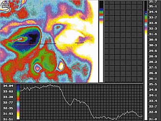 Рис. 1. Лимфома правой орбиты. На гистограмме определяется выраженная гипертермия на пораженной стороне Показательны термографические исследования при озлокачествлении плеоморфной аденомы : соответственно локализации опухоли в четко отграниченной зоне гипотермии удается выявить небольшие участки стойкой гипертермии, что создает пеструю картину (рис. 2).