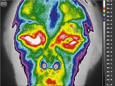 Компьютерная термография в диагностике злокачественных опухолей глаза и орбиты Термография – метод регистрации видимого изображения собственного инфракрасного излучения поверхности тела человека с помощью специальных приборов, используемый в целях диагностики различных заболеваний и патологических состояний. Впервые тепловидение было с успехом применено в промышленности в 1925 г. в Германии. В 1956 г. канадский хирург R. Lawson использовал термографию для диагностики заболеваний молочных желез. Это открытие положило начало медицинской термографии. Применение термографии в офтальмологии связывают с публикацией в 1964 г. Gross et al., применивших термографию для обследования больных с односторонним экзофтальмом и обнаруживших гипертермию при воспалительных и опухолевых процессах орбиты. Им же принадлежит и одно из наиболее обширных исследований нормального термопортрета человека. Первые термографические исследования у нас в стране выполнили М.М. Мирошников и М.А. Собакин в 1962 г. на отечественном аппарате. В.П. Лохманов (1988 г.) определил возможности метода в офтальмоонкологии. Теплопотери с поверхности кожи человека в состоянии покоя при температуре комфорта (18°–20°С) происходят за счет инфракрасного излучения – на 45%, путем испарения – на 25%, за счет конвекции – на 30%. Тело человека излучает поток тепловой энергии в области инфракрасной части спектра с диапазоном длины волны от 3 до 20 мкм. Максимум излучения наблюдается при длине волны около 9 мкм [2]. Величина излучаемого потока достаточна для того, чтобы его можно было обнаружить с помощью бесконтактных приемников инфракрасного излучения. Физиологической основой термографии является увеличение интенсивности инфракрасного излучения над патологическими очагами (в связи с усилением в них кровоснабжения и метаболических процессов) или уменьшение его интенсивности в областях с уменьшенным региональным кровотоком и сопутствующими изменениями в тканях и органах. Преобладание в клетках опухоли процесса анаэробного гликолиза, сопровождающегося большим выделением тепловой энергии, чем при аэробном пути расщепления глюкозы, также ведет к повышению температуры в опухоли. Помимо бесконтактной термографии , выполняемой с помощью термографов, существует контактная (жидкокристаллическая) термография , которую проводят с помощью жидких кристаллов, обладающих оптической анизотропией и изменяющих цвет в зависимости от температуры, а изменение их окраски сопоставляют с таблицами–индикаторами. Термография, являясь физиологичным, безвредным, неинвазивным методом диагностики, находит свое применение в онкологии для дифференциальной диагностики злокачественных опухолей, а также является одним из способов выявления очаговых доброкачественных процессов. Тепловизоры позволяют визуально наблюдать за распределением тепла на поверхности тела человека. Приемником ИК–излучения в тепловизорах является специальный фотогальванический элемент (фотодиод), работающий при охлаждении его до –196°С. Сигнал с фотодиода усиливается, преобразуется в видеосигнал и передается на экран. При различной степени интенсивности излучения объекта наблюдаются изображения разного цвета (каждому уровню температуры соответствует свой цвет). Разрешающая способность современных термографов составля