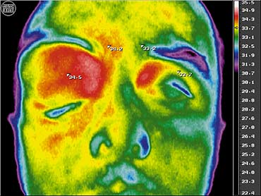 Puc. 2. Рак в плеоморфной аденоме левой орбиты Термографическая картина вторичных злокачественных опухолей орбиты характеризуется зоной выраженной разлитой гипертермии, захватывающей и внешне непораженные области орбиты и параорбитальной зоны, что обусловлено застойными явлениями в венах кожи лба и щеки. При прорастании опухоли из придаточных пазух носа к описанной картине присоединялись гипертермия соответствующей пазухи носа или пораженной области (рис. 3).