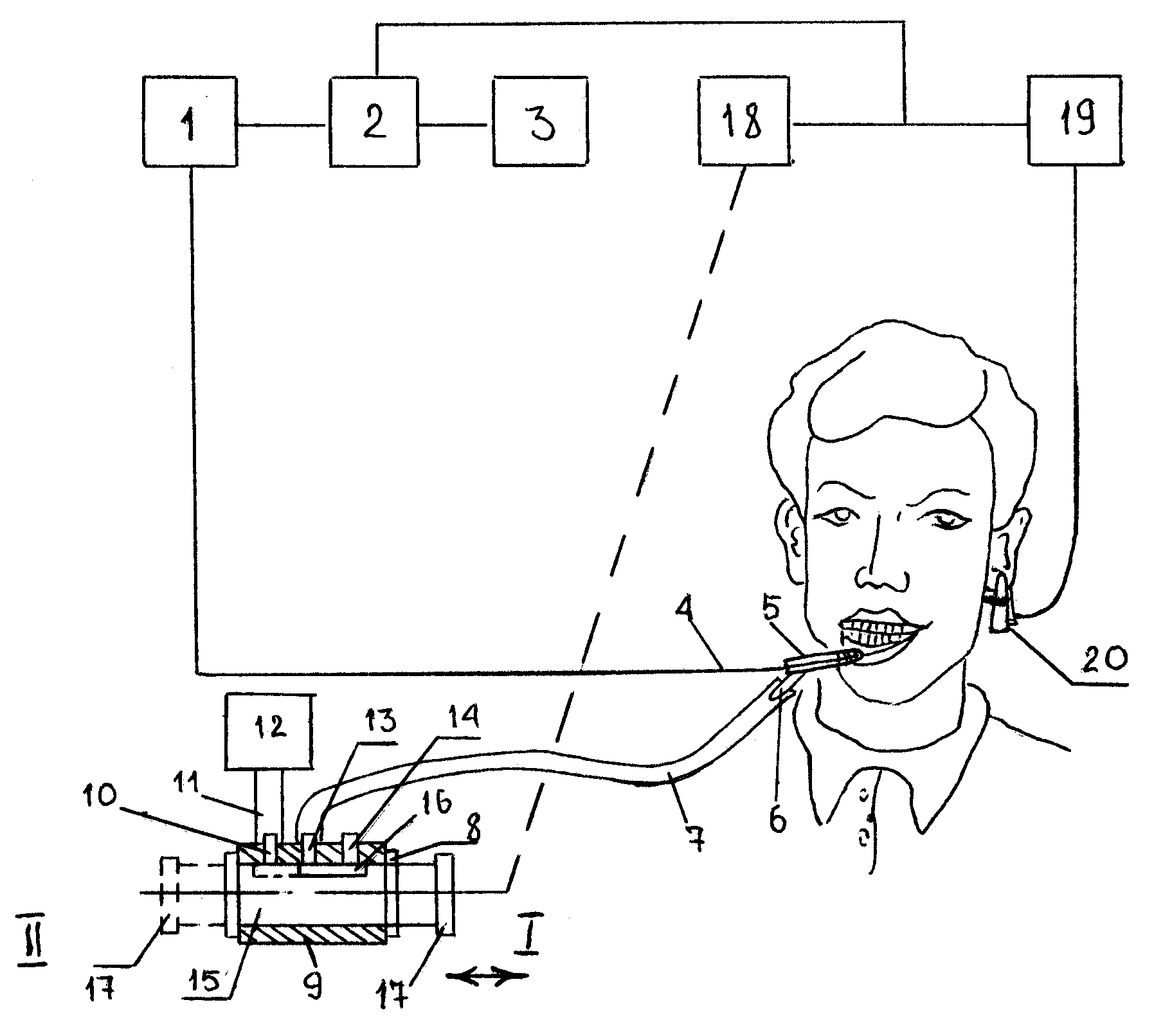 Сигнал с датчика пульса (20) через усилитель (19) поступает на электромагнитное реле (2), которое срабатывает, подключая источник питания (3) к лазеру (1). Излучение лазера по световоду (4) поступает на очаг поражения. На конце световода установлен трубчатый прозрачный наконечник (5), внутренняя полость которого с помощью штуцера (6) и вакуумпровода (7) связана с переключателем (8), состоящим из корпуса (9) с клапаном (10) , к которому с помощью шланга (11) подключен источник (12) вакуума, клапаном (13), соединенным через шланг (7) и штуцер (6) с корпусом (5), клапаном (14), связанным с атмосферой с помощью подвижного элемента (15) с полостью (16) и упорами (17). Подвижный элемент (15) кинематически соединен со штоком электромагнита (18), катушка управления которого подключена через усилитель (19) к датчику (20) пульса, который закрепляется на мочке уха или губе больного. Способ осуществляют следующим образом: после ликвидации местных экзогенных факторов в лечебно-профилактические мероприятия включена БВЛТ. Воздействие гелий-неоновым лазером (ГНЛ) осуществляли в два этапа. 1 этап: на область очага поражения воздействовали излучением длиной волны 632,8 нм и мощностью 100-200 мВт/см2 в течение 1-2 минут на одно поле. Такое воздействие оказывает анальгезирующее и противовоспалительное действие. Далее осуществляли 2 этап: на область патологического очага воздействовали в период систолы пониженным давлением 20-80 мм.рт.ст. и лазерным излучением при плотности мощности 0,1-10 мВт/см2. Сочетанное воздействие осуществляли от нескольких секунд до 1-2 минут на одну точку в зависимости от стойкости капиляров десны, при этом за одну процедуру проводили 5-8 воздействий на область патологического очага, лечение проводили через день, курс - 5-6 процедур. Больным 2-ой группы осуществляли лазеротерапию по общепринятой методике мощностью 100-200 мВт/см2, 0,5-2 минуты на одно поле, суммарно 15-20 минут, на курс 9-10 процедур [10]. Так, положительный эффект после применения традиционных средств в подготовительном этапе лечения наблюдали у 31% человек, а включение в комплекс лечебно-профилактических мероприятий лазеротерапии позволило повысить положительный результат на 16%. Вместе с этим, в третьей группе хороший результат лечения после применения разработанных вариантов методов биосинхронной вакуум-лазеротерапии в подготовительном этапе лечения получен у 57% больных, удовлетворительный - у 19%, неудовлетворительный - у 6% процентов больных, что составляет положительный результат в 82% случаев. Таким образом, включение биосинхронной вакуум-лазеротерапии в подготовительном этапе лечения заболеваний периодонта повышает терапевтический эффект на 35%, что свидетельствует о целесообразности более широкого использования ее в практической стоматологии.